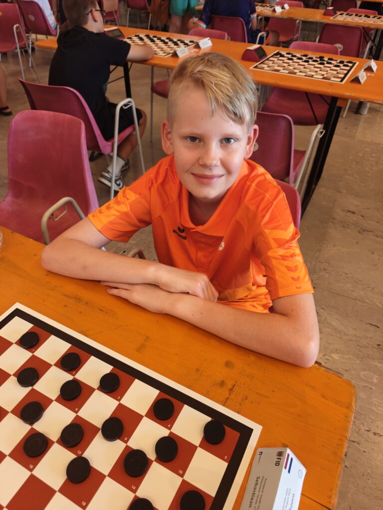 Vandaag Blitz. Die potjes gaan nog sneller. Die zijn 5min +3sec. Dan zijn ze van 9 uur tot 12.30 aan het dammen. Eind van de middag is de prijsuitreiking. Iedereen heeft geoefend op het Wilhelmus, want die gaat een paar keer gezongen worden. En dat lijkt ons ook heel gaaf om eens mee te maken